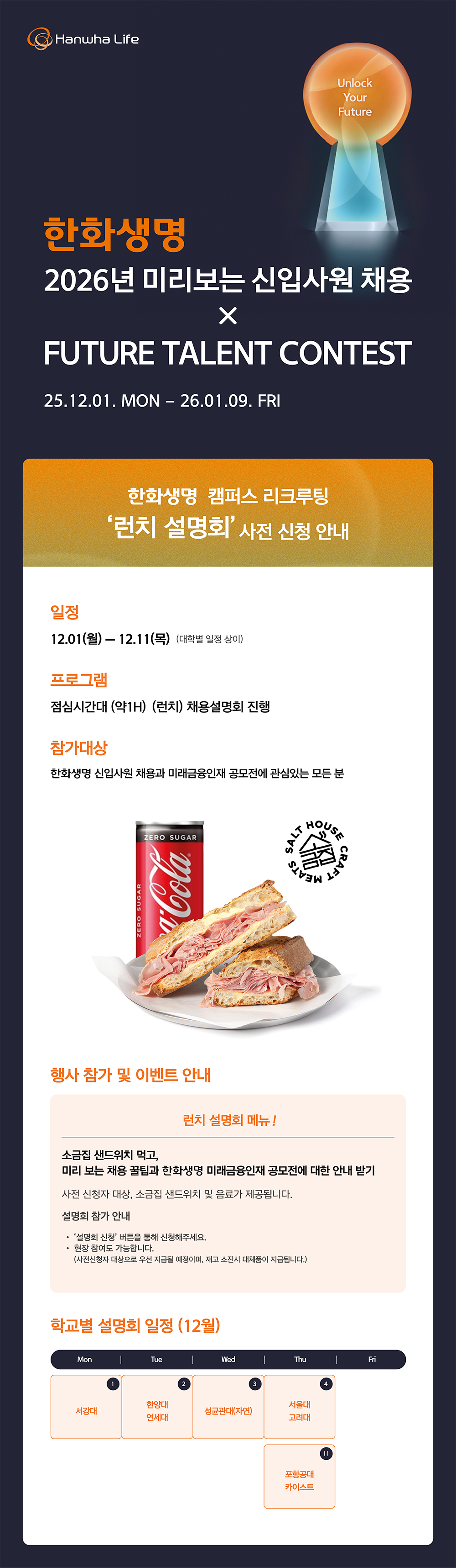 한화생명 2026년 신입사원 채용 X FUTURE TALENT CONTEST 26년 채용 및 공모전이 궁금하신가요? 채용담당자의 꿀팁 받아가세요! ■12월 4일(목) 채용상담회 | 11:00 - 15:00 / LG POSCO관 3층 로비 런치설명회 | 12:20 - 13:20 / 현대차 경영관 B307호 ※런치설명회에 참석하시면 잠봉뵈르 샌드위치와 음료가 준비되어 있으니 많은 관심 부탁드리겠습니다. ■런치설명회 사전 신청하기▶https://www.careertalk.kr/event-pin/9061661 한화생명 2026년 신입사원 채용 한화생명 Break Fast 전형이란? 여름방학(6주) 인턴십 이후, '27년 1월에 입사하는 전형으로서 입사 5개월 전 취업이 확정되므로 나를 위한 휴식이 가능합니다. ■ 자격요건