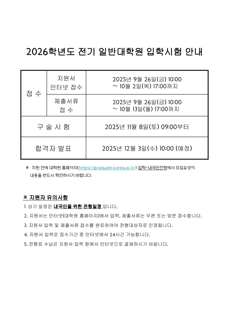제목 [입학] 2026학년도 전기 일반대학원 입학시험 안내