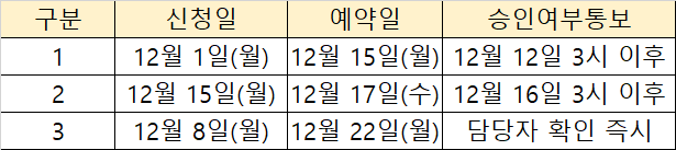 - 최소 1일 전 신청 요망 (행정팀 사정에 따라 당일 예약은 승인 여부 미통보 가능)