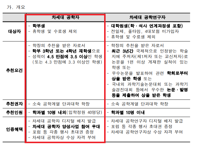 우수한 학생의 경우, 차세대 공학자로 추천할 예정이니 아래의 내용을 참고하여